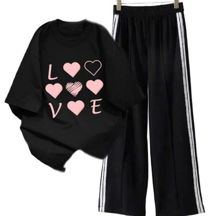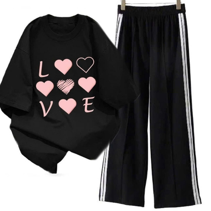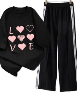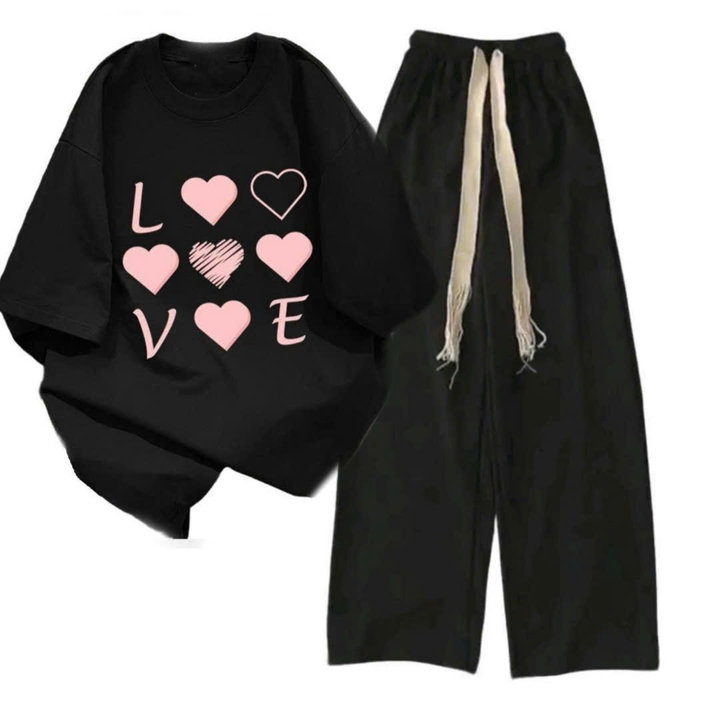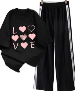 – Tên Sản phẩm: Sét bộ mùa hè quần ống suông dáng dài viền rót 95cm+mix áo phông form rộng tay lỡ – chữ LOVE