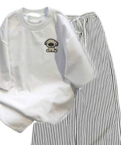 – Tên Sản phẩm: sét bộ quần đũi xốp kẻ sọc + mix áo phông in hình cún nâu ở ngực