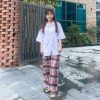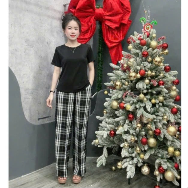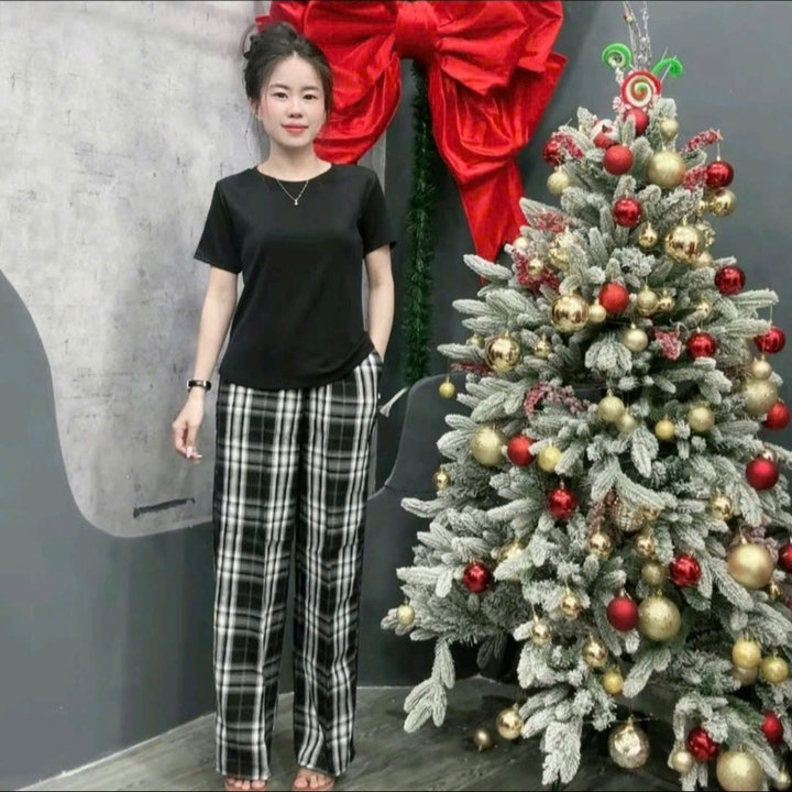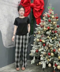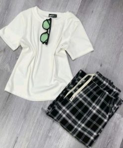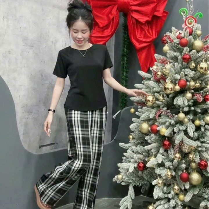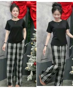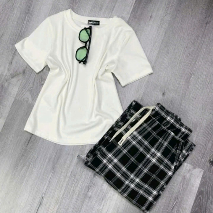 – Tên Sản phẩm:Set bộ quần kẻ Caro đen + áo phông Croptop cộc tay trơn chất tăm hàn lạnh