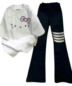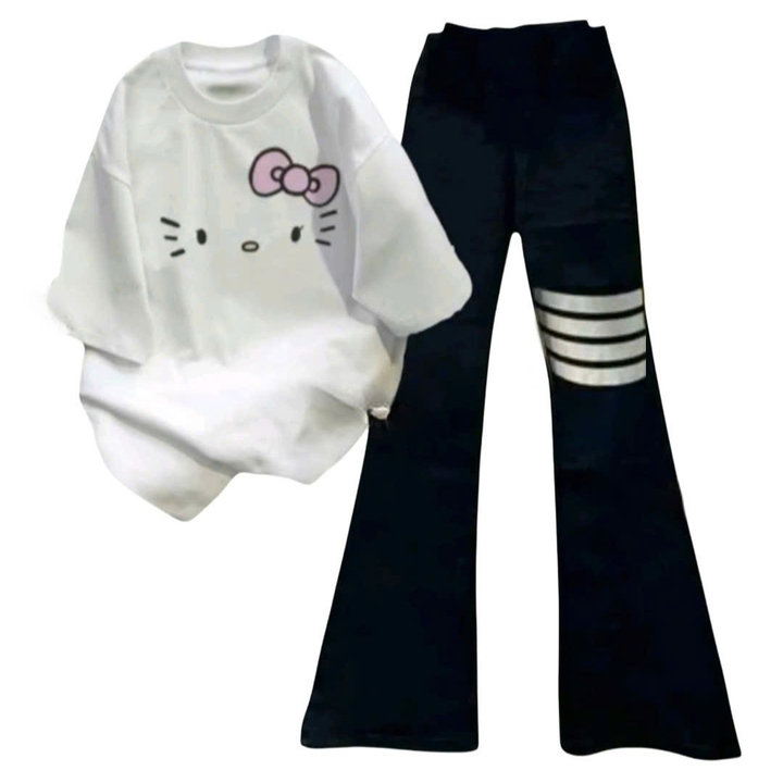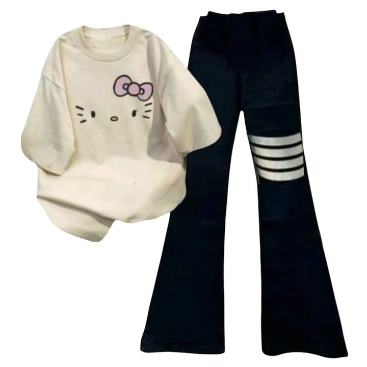 – Tên Sản phẩm: Sét bộ quần loe 4 sọc chất co dãn dài 95cm+ mix áo phông mèo nơ Đơn Giản Bassic
