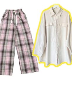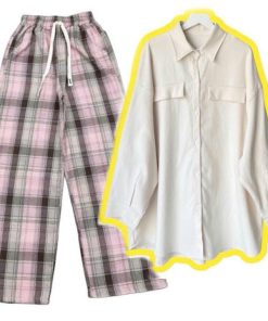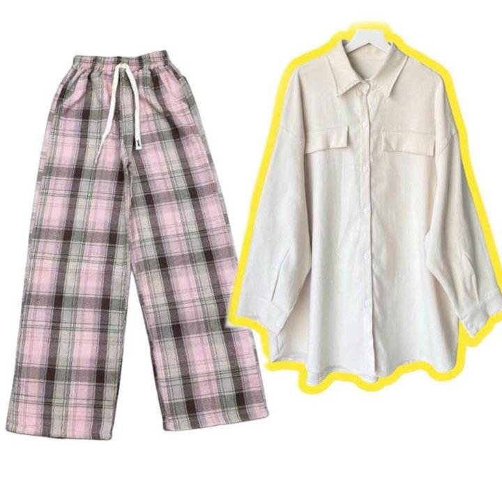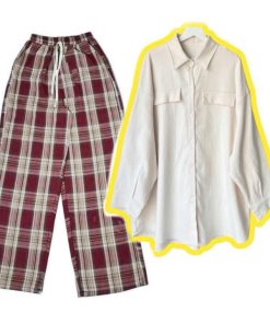 – Tên Sản phẩm: Sét Bộ Quần Ống Suông Kẻ Caro + Mix Áo Sơ Mi Nhung Quốc Dân