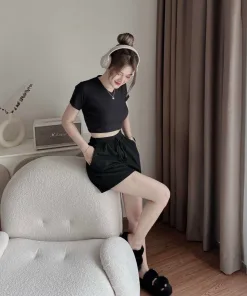 Set đồ bao gồm áo thun cổ tim dáng croptop kèm quần sort thun.