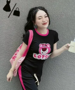 SET BỘ THUN NỮ GÂN ÁO TAY NGẮN THÊU HÌNH GẤU DD990 – NANA FREESIZE < 56KG