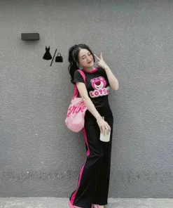 Set bộ đồ nữ thun gân áo tay ngắn thêu hình gấu đáng yêu mix quần ống rộng phối viền cực kì sang chảnh, tôn dáng