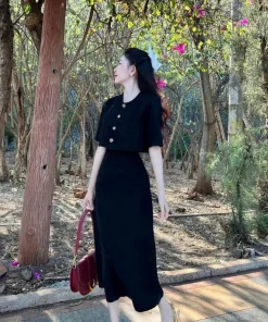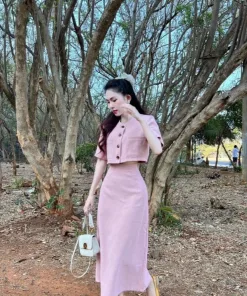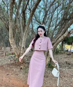 SET BỘ VÁY NỮ ÁO CROTOP ĐÍNH NÚT MIX CHÂN VÁY DÀI DD015 – NANA FREESIZE < 54KG