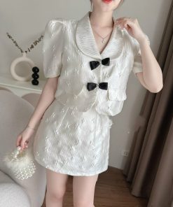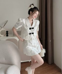 Tên sản phẩm: SET CHÂN VÁY CÓ LÓT KÈM ÁO TAY PHỒNG CỔ CHỮ V CÀI NÚT ĐÍNH NƠ CHẤT XỐP PHỒNG HOA T586