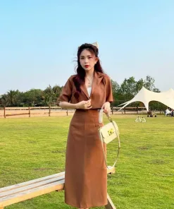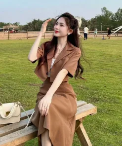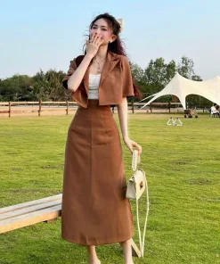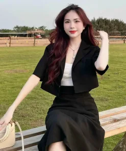 Set áo và chân váy nữ sét bộ 3 món áo tay ngắn cổ vét và áo lót bên trong phối chân váy dài sang chảnh