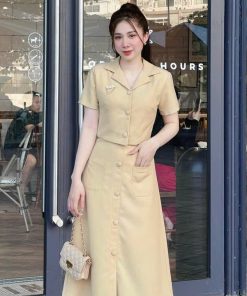 SET COTTON LẠNH PHỐI CHÂN VÁY DÀI LƯNG THUN KHÓA KÉO NÚT BỌC BT105T- SAM FREESIZE < 53KG