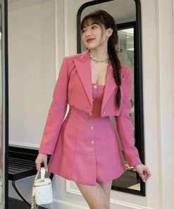 Set đầm dây áo khoác vest màu hồng siêu cưng