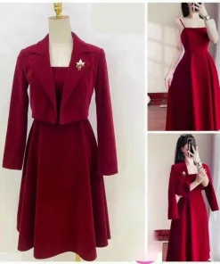 - Set đồ bao gồm đầm xòe, áo khoác cổ vest.