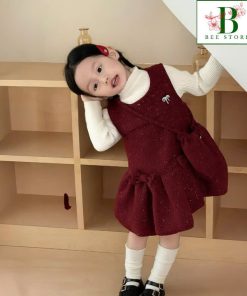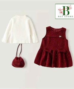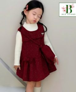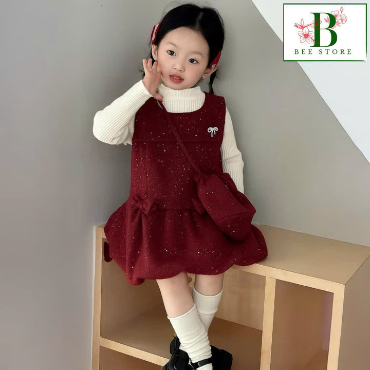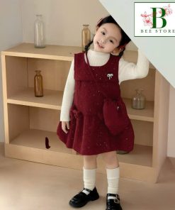 1. Tên sản phẩm : Set Đầm Nhung Đính Đá Bé Gái & Túi Đeo Tone Đỏ Từ 12-33kg Dành Cho Bé Gái