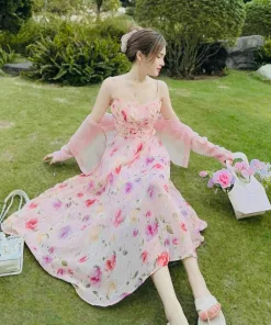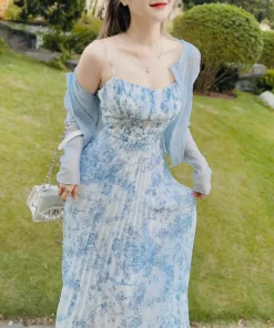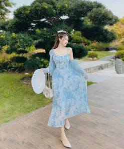 Set bộ đồ váy nữ 2 dây maxi đi biển voan bông xinh xắn với 2 tone màu hồng, xanh sáng da dành cho các tình yêu
