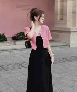 SET ĐẦM VÁY NỮ THUN BORIP 2 DÂY MIX ÁO KHOÁC LINEN SA854 – SAM FREESIZE < 55KG