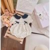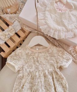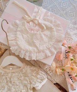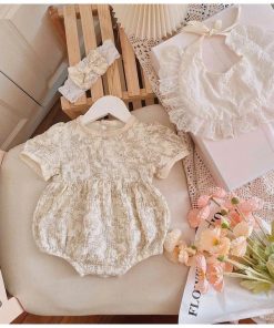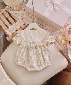 Set Đồ Liền Thân Body Yếm Ren Cổ Rời Băng Đô Kem Bé Gái Sơ Sinh 1 2 Tuổi