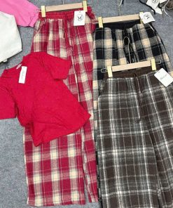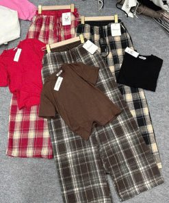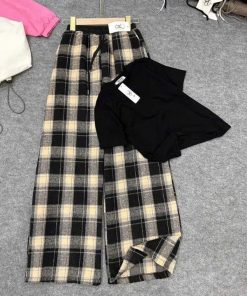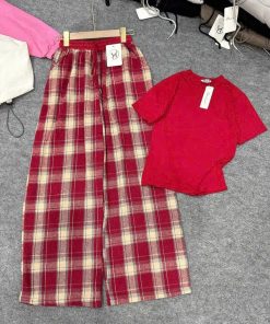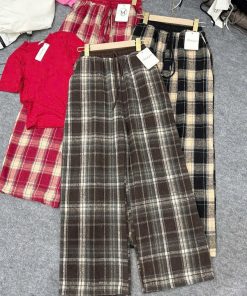 Tên sản phẩm: SET ĐỒ NỮ ÁO THUN COTON TRƠN PHỐI QUẦN ỐNG SUÔNG CARO DẠ TP76 – GOLDEN DREAM