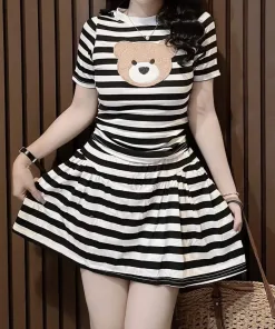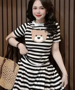 +++THÔNG TIN CỤ THỂ SET ĐẦM VÁY SỌC FREE SIZE 40 – 55 KG CHẤT THUN HOẠ TIẾT GẤU CUTE