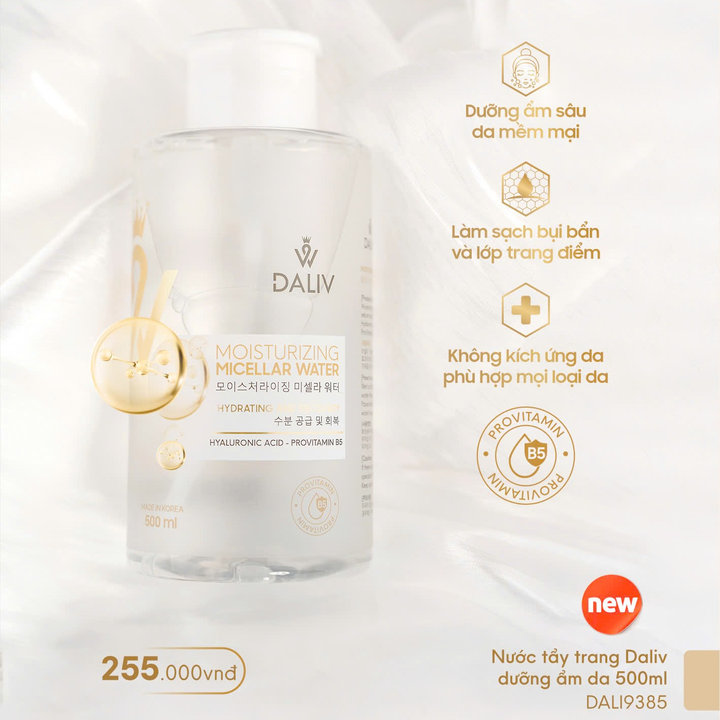 • Nước tẩy trang Daliv giúp làm sạch bụi bẩn và lớp trang điểm mà vẫn duy trì độ ẩm, giúp da luôn mịn màng, tươi sáng