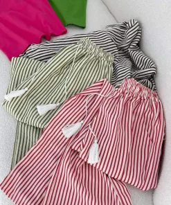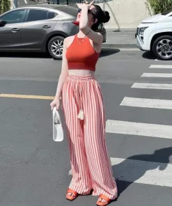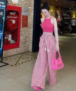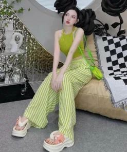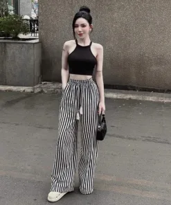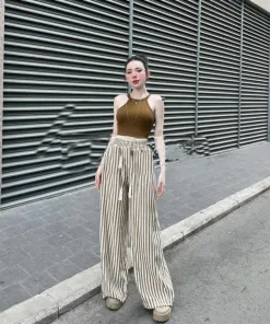 Set nữ, bộ áo yếm dáng croptop phối quần suông ống rộng sọc