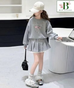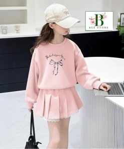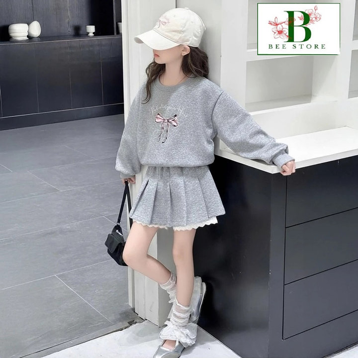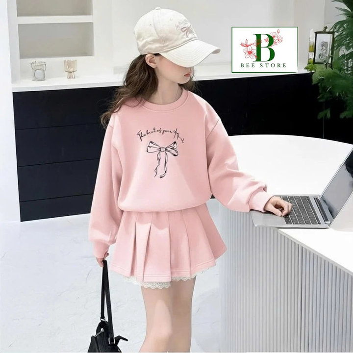 Set Váy Bé Gái Chất Nỉ Da Cá 4C Áo Form Rộng Nơ Mix Chân Váy Xếp Ly Viền Ren Từ 12-45KG Dành Cho Bé Gái