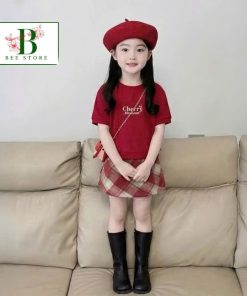 1. Tên sản phẩm : Set Váy Bé Gái Phối Nơ + Chân Váy Caro Dạ Chữ A Từ 8-45kg Dành Cho Bé Gái