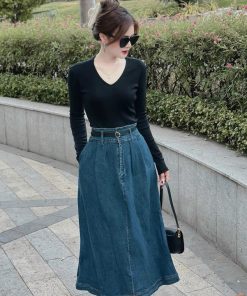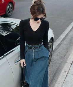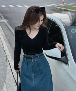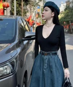 SET VÁY DENIM PHỐI ÁO THUN TĂM TAY DÀI KÈM DÂY ĐAI STH10511-SAM FREESIZE < 53KG