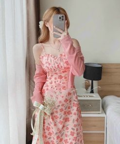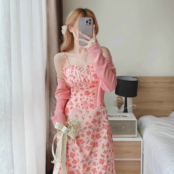 Tên sản phẩm: SET VÁY HOA NHÍ TIỂU THƯ HAI DÂY KÈM ÁO KHOÁT V487 – HAKA MÂY