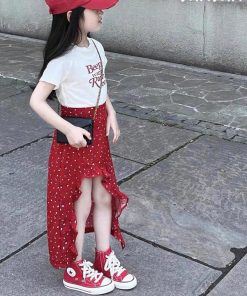1. Tên sản phẩm : Set Váy Midi Bé Gái Đỏ Nổi Bật – Áo Thun In Chữ Kèm Chân Váy Lụa Bèo Xẻ Tà Nàng Thơ Từ 20-45kg Dành Cho Bé Gái