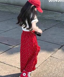 Set Váy Midi Bé Gái Đỏ Nổi Bật – Áo Thun In Chữ Kèm Chân Váy Lụa Bèo Xẻ Tà Nàng Thơ Từ 20-45kg Dành Cho Bé Gái