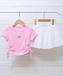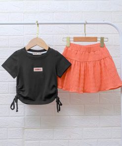 1. Tên sản phẩm : Set Váy Thun Gân Áo Đính Logo Min Min Bé Gái Từ 12-45kg Cho Bé Gái