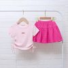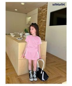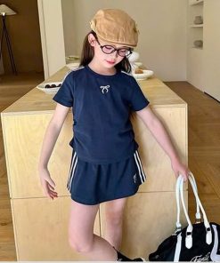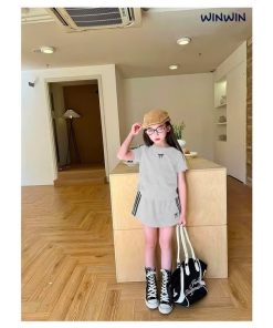 1. Tên sản phẩm : Set Váy Thun Thể Thao Bé Gái Ngắn Tay Viền Sọc In Nơ Từ 12-45kg Cho Bé Gái