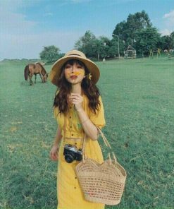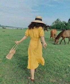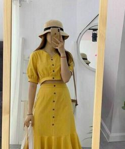 Tên sản phẩm: Set váy vàng đuôi cá đính nút croptop tay bồng V87 – CLOUDY DRESS