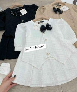 - Sét váy đẹp sẽ giúp các nàng tự tin mọi lúc, mọi nơi. Cổ áo đính nơ sang chảnh, kiểu dáng đơn giản nhưng không kém phần sang trọng. Thích hợp đi các buổi tiệc sinh nhật bạn bè, các buổi cà phê, dạo phố….