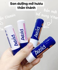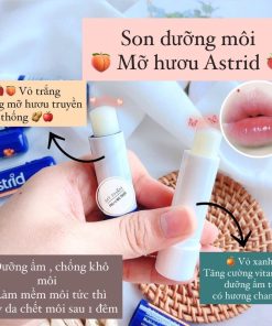 – Son dưỡng Astrid với thành phần chính là mỡ hươu, vitamin E và bơ kakao giúp môi mềm, căng mọng ngay.