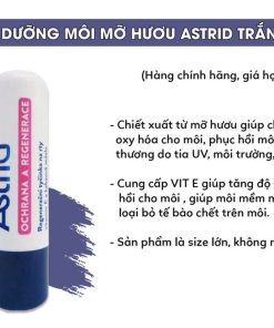– Son dưỡng Astrid với thành phần chính là mỡ hươu, vitamin E và bơ kakao giúp môi mềm, căng mọng ngay.