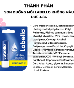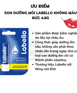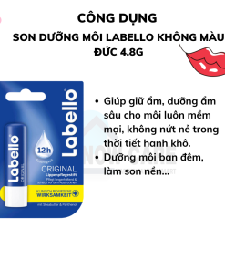 - Son dưỡng môi Labello Original giúp làn môi căng mọng, mịn màng, chống khô và nứt môi. Công thức Hydra IQ và các thành phẩm dưỡng ẩm chiết xuất từ quả bơ hạt mỡ giúp dưỡng ẩm lâu dài. Lớp nhũ mỏng lấp lánh mang tới cho bạn làn môi thơm dịu, mềm mại.