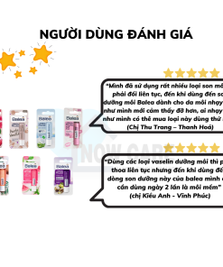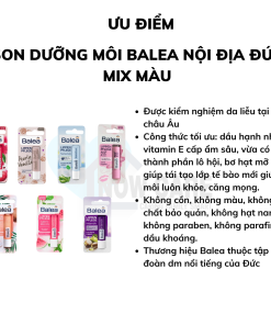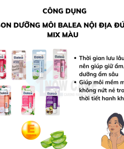 - Balea Lip Balm được bào chế đặc biệt cho đôi môi khô cần được chăm sóc. Công thức chăm sóc nhẹ nhàng với lô hội, vitamin E, bơ và dầu hạnh nhân giúp cấp ẩm và dưỡng môi mềm mịn.