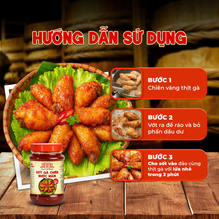– Chỉ cần rưới sốt lên gà mới chiên hoặc đảo nhanh trên chảo nóng, lớp sốt bám đều, tạo độ bóng đẹp, thơm đậm và cực kì đưa cơm. Phù hợp cho gà chiên, cánh gà, sụn gà, hải sản hoặc dùng làm sốt ướp để tăng hương vị mặn ngọt kiểu làng chài xưa.