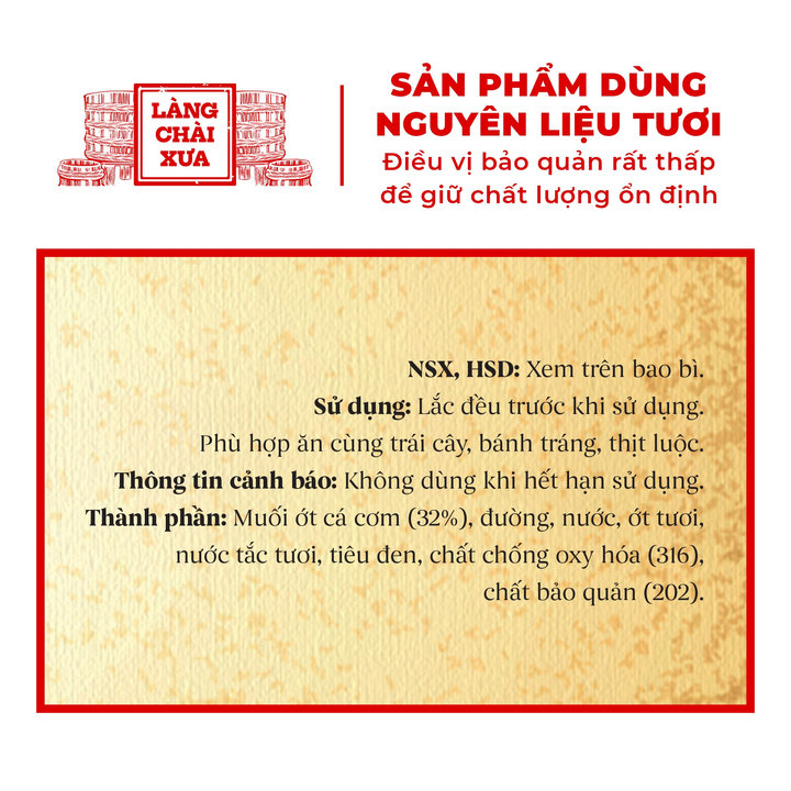 – Thành phần: Muối ớt cá cơm (32%), đường, nước, ớt tươi, nước tắc tươi, tiêu đen, chất chống oxy hóa (316), chất bảo quản (202)