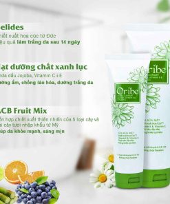 - Sữa rửa mặt Oribe với chiết xuất hoa Cúc (hoạt chất trắng da từ CLR-Đức, được nghiên cứu lâm sàng hiệu quả sau 14 ngày) cùng chiết xuất 5 loại trái cây giúp lấy đi các tế bào chết gây sạm da, xỉn màu; làm sạch bụi bẩn, bã nhờn đồng thời cung cấp dưỡng chất từ hạt vitamin E giúp da sáng trắng, mịn màng, đàn hồi.