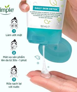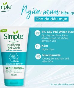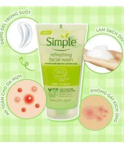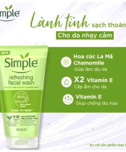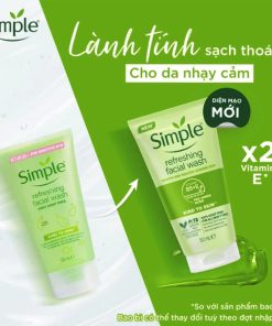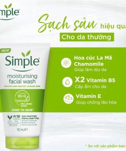 – Sữa rửa mặt Simple cho bạn một làn da ẩm, mềm mịn nhẹ dịu, sạch sâu dưới lỗ chân lông. Ngay cả với da khô, sản phẩm cũng đồng thời cung cấp nước, giữ ẩm giúp da luôn căng bóng, tươi hồng.