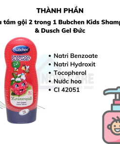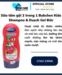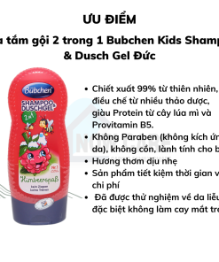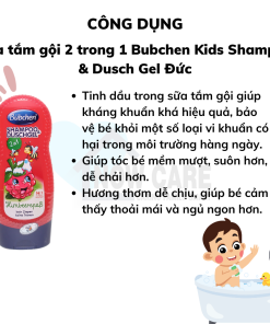 - Sữa tắm gội Bubchen Kids Shampoo & Duschgel là sữa tắm và gội chung trong một sản phẩm, mang đến sự thuận tiện và tiết kiệm chi phí cho mẹ, với các hoạt chất từ thiên nhiên mang tới độ pH trung tính làm sạch nhẹ nhàng làn da và mái tóc của bé. Đồng thời, sản phẩm giúp dưỡng ẩm hiệu quả, nuôi dưỡng làn da khỏe mạnh, mịn màng và mái tóc suôn mượt hơn. Sản phẩm không chứa chất bảo quản, không gây kích ứng da, rất lành tính cho bé.