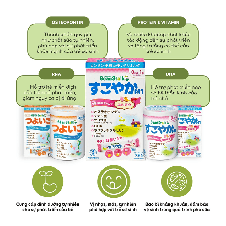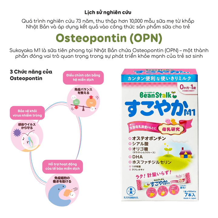 Sữa bột công thức Bean Stalk Sukoyaka là thành quả của cuộc Khảo sát Sữa Mẹ Toàn quốc lần thứ 3, khởi đầu từ năm 2015. Đây là sản phẩm tiên phong tại Nhật Bản chứa Osteopontin – một thành phần quý giá đóng vai trò quan trọng trong sự phát triển khỏe mạnh của trẻ sơ sinh.