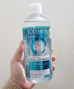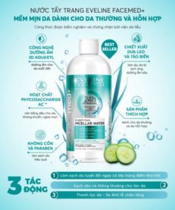 Công dụng: Nước tẩy trang với 3 tác động vượt trội, nhẹ nhàng tẩy sạch bụi bẩn và dầu thừa trên da, thậm chí cả lớp trang điểm không trôi trên mắt và môi. Hoạt chất Phycosaccharide AC™ cân bằng lượng dầu trên da, ngăn ngừa hình thành các đốm mụn đầu đen. Chiết xuất dưa leo và tảo biển nhanh chóng làm dịu vùng da bị kích ứng, giúp dưỡng ẩm sâu, loại bỏ hoàn toàn nỗi lo khô da sau tẩy trang. Với độ pH trung tính, không chứa cồn và paraben, nước tẩy trang Eveline Facemed+ sạch sâu 3 tác động 400ML giúp phục hồi làn da sạch mịn, tươi sáng.
