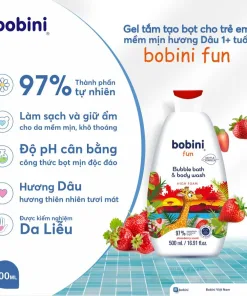 Gel tắm trẻ em tạo bọt Bobini Fun mềm mịn hương dâu tây 1+ tuổi 500ML nhẹ nhàng làm sạch cơ thể. Các thành phần dưỡng ẩm giúp da mịn màng và mềm mại sau khi tắm. Công thức độc đáo với 97% thành phần tự nhiên, khả năng tạo bọt mịn giữ ẩm da cùng hương thơm dâu tây giúp bé thích thú.