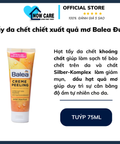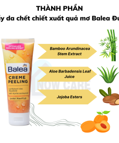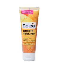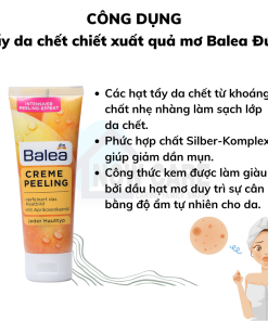 - Tẩy da chết Balea Creme Peeling với các hạt tẩy da chết khoáng chất. Giúp làm sạch lớp tế bào chết trên da. Phức hợp chất Silber-Komplex giảm dần mụn và giảm sự xuất hiện của mụn mới. Công thức được làm giàu bởi dầu hạt quả mơ giúp duy trì sự cân bằng độ ẩm tự nhiên cho da.