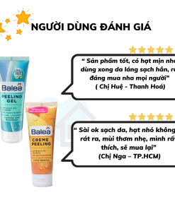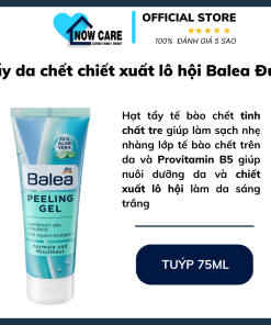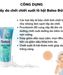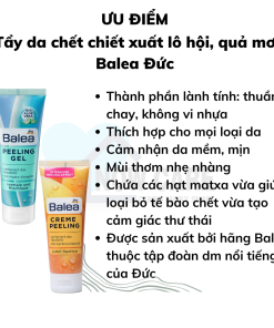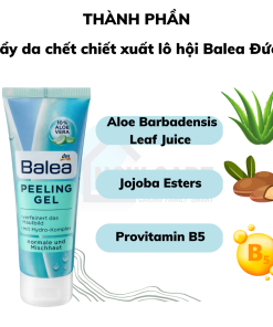 - Tẩy tế bào chết Balea Peeling Gel với các hạt tẩy tế bào chết tinh chất tre giúp làm sạch nhẹ nhàng lớp tế bào chết trên da. Đồng thời, Provitamin B5 giúp nuôi dưỡng da và chiết xuất lô hội làm da sáng trắng dần lên.