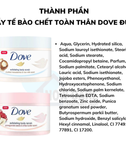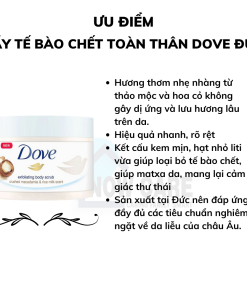 - Kem tẩy tế bào chết Dove exfoliating body scrub 225ml bản Đức giúp làm sạch da chết, sần sùi. Nuôi dưỡng và tái tạo các chất dinh dưỡng cho da. Kem tẩy tế bào chết Dove nhẹ nhàng phục hồi da giúp làn da mềm mại, sáng mịn.