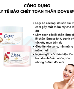- Để cho sản phẩm đạt được hiệu quả tốt nhất, bạn có thể xông hơi 15 phút trước khi tẩy da chết, để các lỗ chân lông giãn nở, Tẩy tế bào da chết Dove sẽ loại bỏ được toàn bộ tế bào chết dưới da.