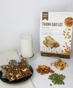 - Thanh gạo lứt thành phần chính là gạo lứt, hạt bí xanh, hạnh nhân, điều, mật ong, rong biển kết hợp hoàn hảo tạo ra sản phẩm ngon miệng và đầy đủ dinh dưỡng.