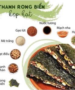 – Thanh rong biển kẹp hạt giòn tan là sản phẩm được làm từ các loại hạt như hạnh nhân, hạt điều, hạt bí xanh, hạt vừng trắng, đậu phộng, gạo lứt, mật ong, dầu dừa, rong biển và muối hồng. Sản phẩm có thời hạn sử dụng là 06 tháng và được sản xuất tại Việt Nam.